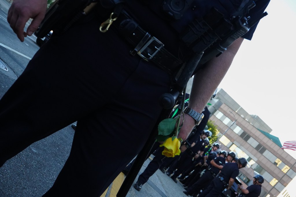 An offier places a flower given to him by protesters in front of his baton in front of Metro Detention Center (Sean Beckner-Carmitchel)