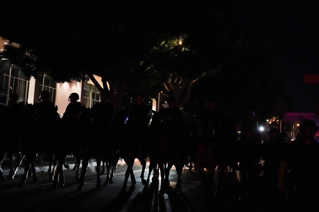 LOS ANGELES — A crowd of hundreds gathered in the late afternoon Saturday outside the Metro Detention Center in downtown Los Angeles, turning what began as a nearly universally peaceful rally into officers carrying dozens of batons, “less lethal” munitions and wooden swords held by Los Angeles Police Department (LAPD) officers.