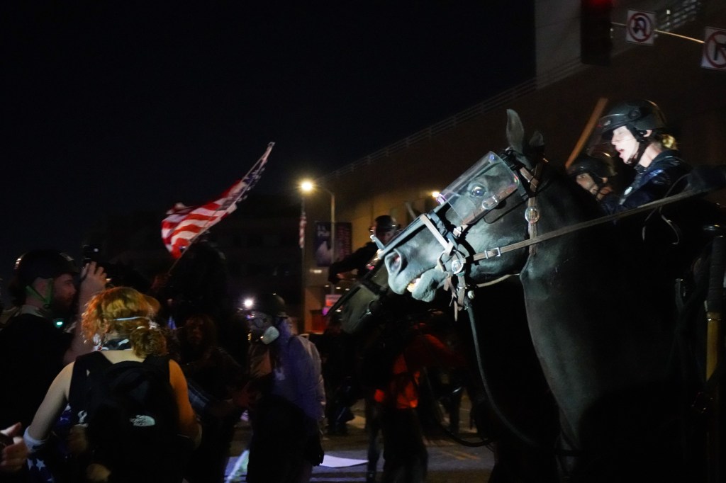 When the horses arrived, chaos ensued. Protesters went in nearly every direction. Several screamed in fear, attempting to run away. Officers gave conflicting orders to protesters, in several cases forcing them into an area where they were then batoned or shot by “less lethal” munitions by other officers.