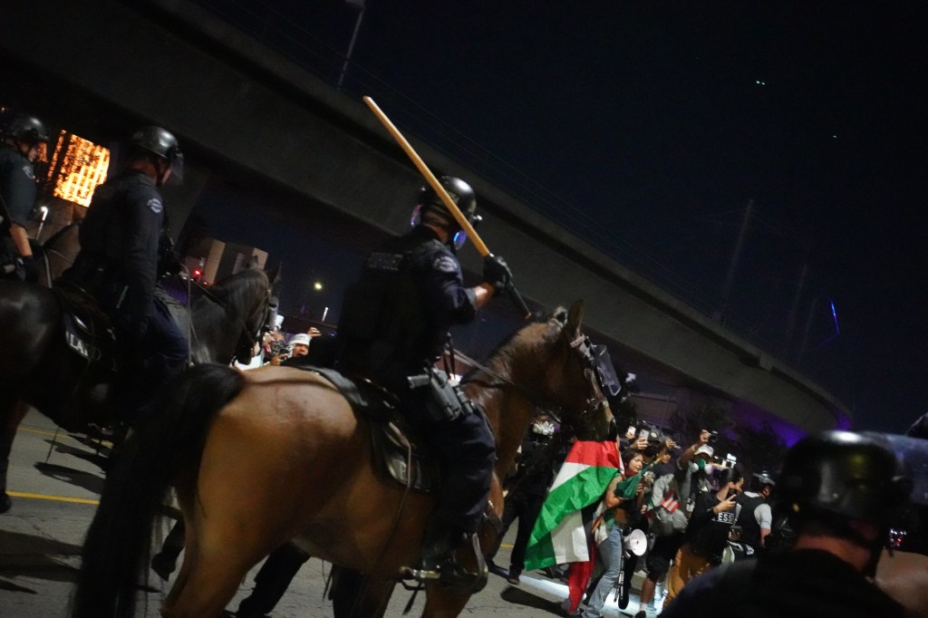 LAPD horse mounted units charge into protesters, as officers riding them slash and hit protesters with bokken (Sean Beckner-Carmitchel)