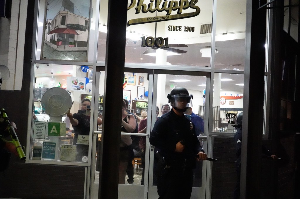 As officers continued to move protesters, local French Dip legend Philippe The Original allowed several demonstrators in its doors. They flipped off officers, watching others continue to get moved down the street.