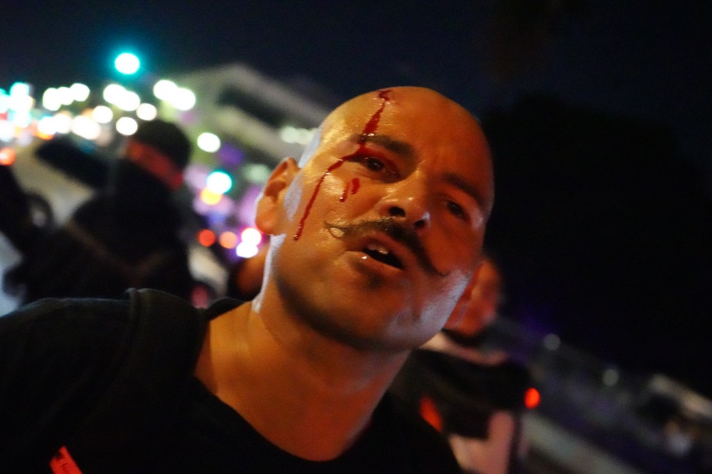 After the rush, several journalists, including Ten Four were told by LAPD officers “we don’t want you to get caught in the rush.” They were then told that they must “remain far behind, you’re gonna be behind officers and you’re gonna get hurt. I don’t want you to get hurt.” Pictures on social media show dozens of injuries to demonstrators and media. Welts to the face and head caused by bokken were observed by Ten Four. “Less lethal” projectiles caused bruises and lacerations to several protesters as well.
