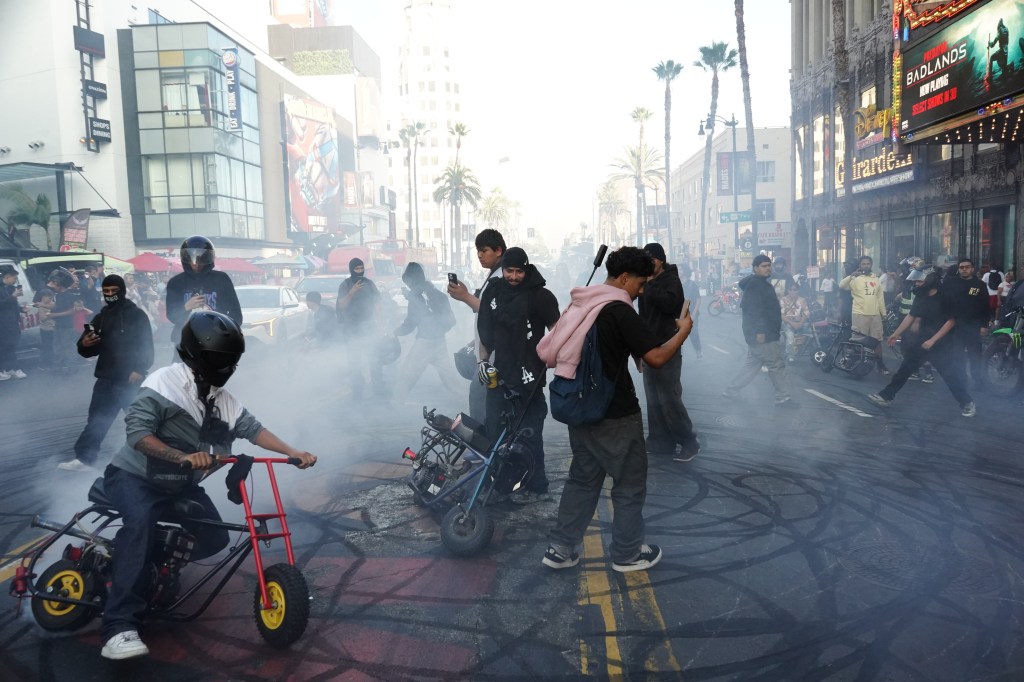 A rider begins to slide and spew smoke from his minibike near a TMZ Tour Bus on Hollywood Boulevard (Sean Beckner-Carmitchel)