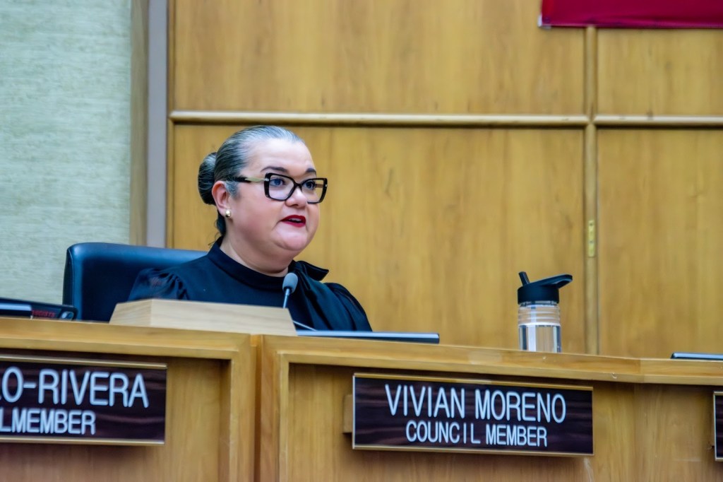 Vivian Moreno speaks about Item #608 regarding federal overreach and ICE abuses during the afternoon session of the San Diego City Council meeting on February 2, 2026 (Jake Lee Green / Aeon Photo Co.)