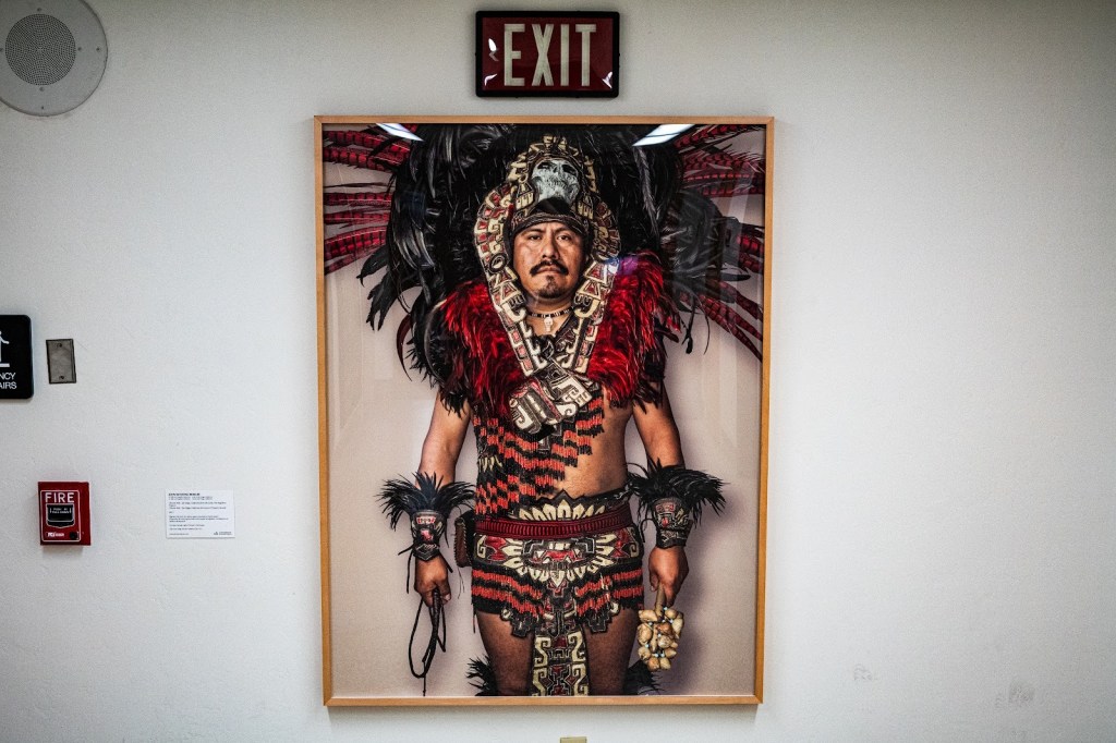 A photo depicting a man in indigenous garb underneath an exit sign on the 12th floor of the San Diego City Hall Chambers in San Diego, California. (Jake Lee Green / Aeon Photo Co.)